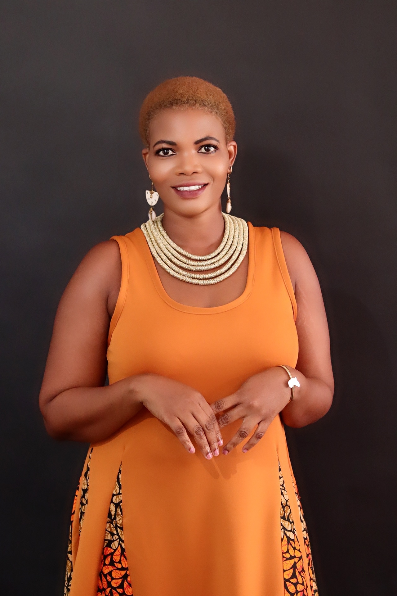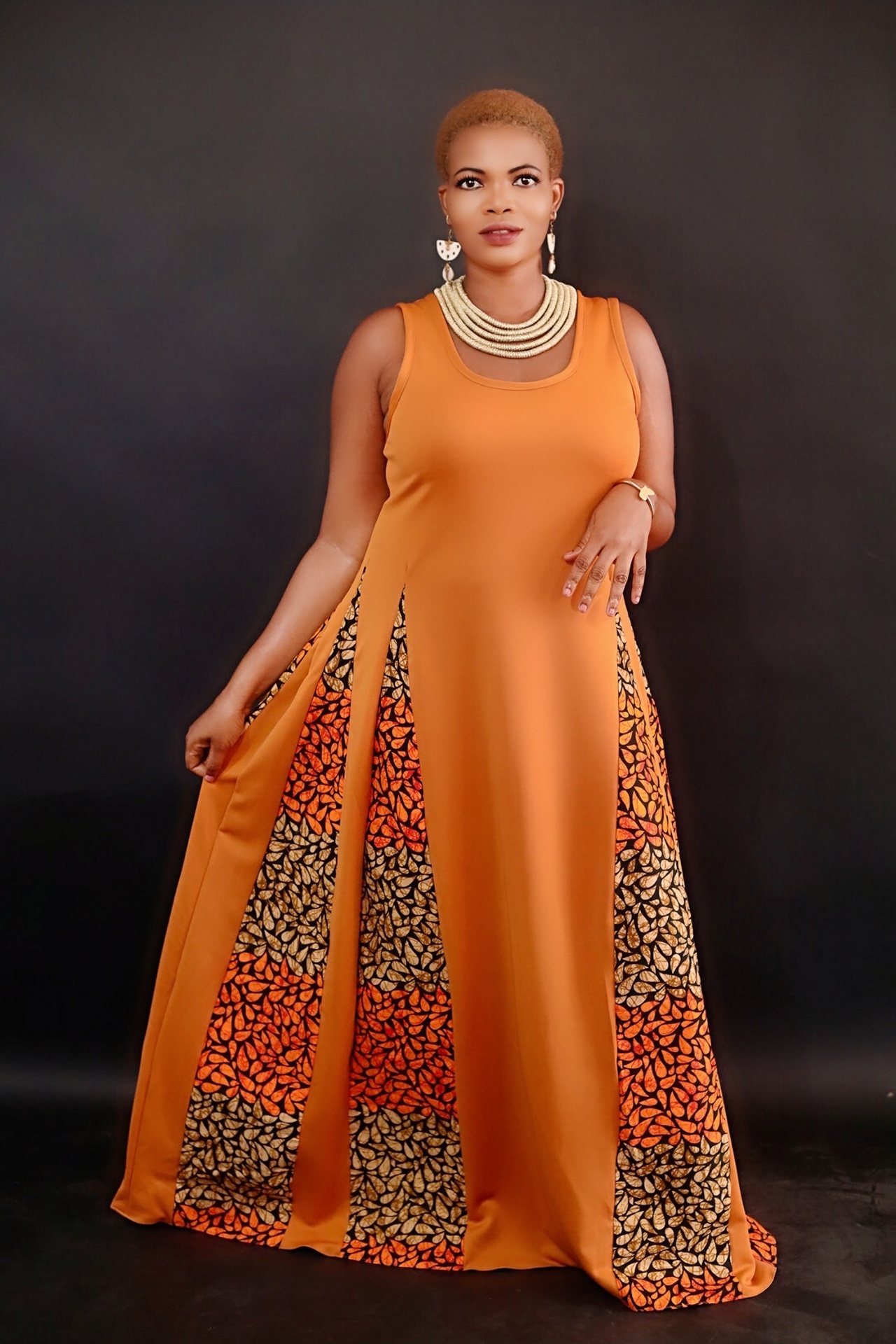 Step into elegance with this orange sleeveless long gown, designed to flow gracefully to the toes. The top features a bold, striking orange hue, while the lower half is beautifully infused with African fabric from the waist to the toe. Adding a cultural twist to its modern Sihoutte. The gown’s floor-lenght finish creates regal and sophisticated look. Making it a true statement piece
