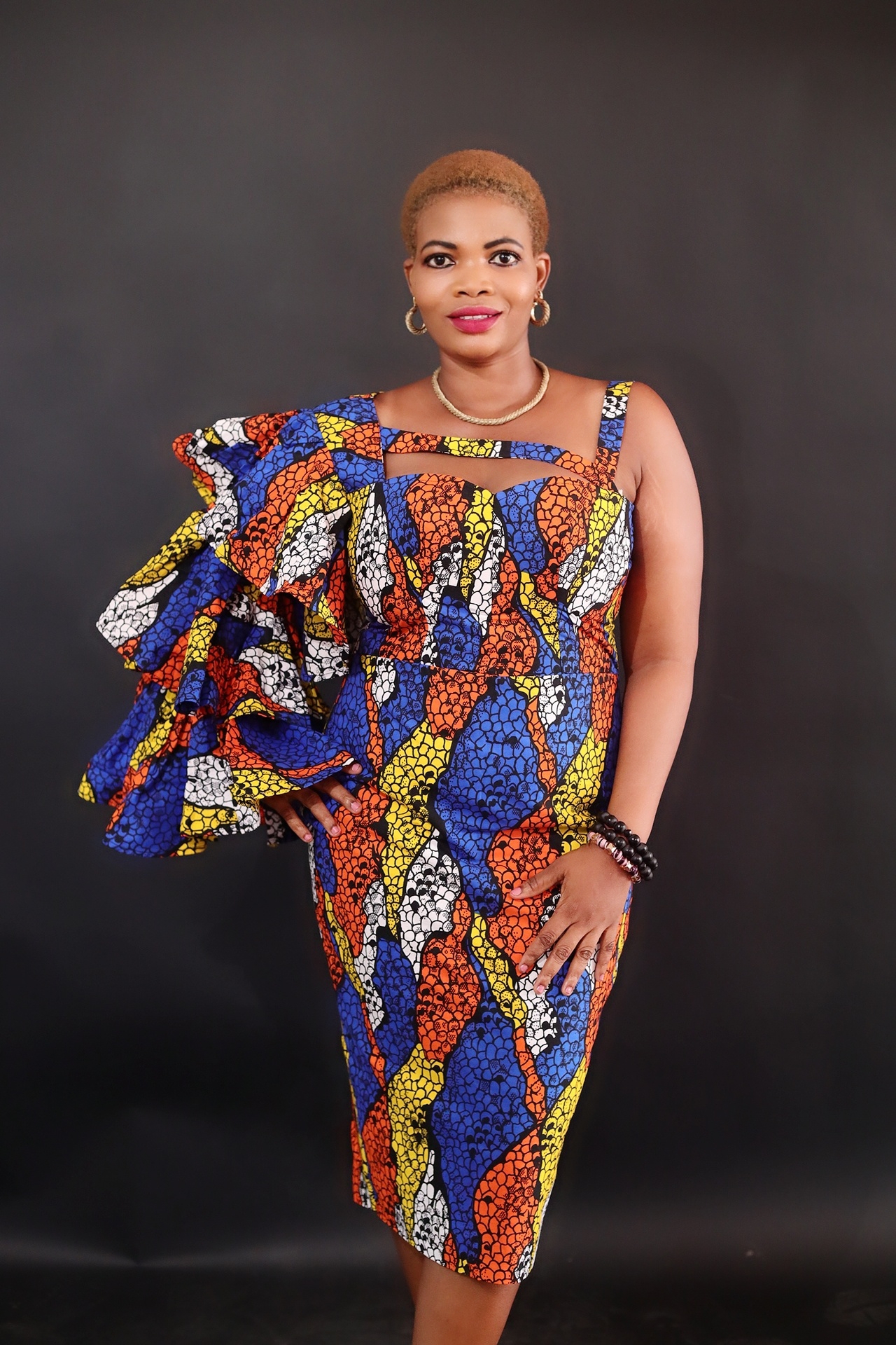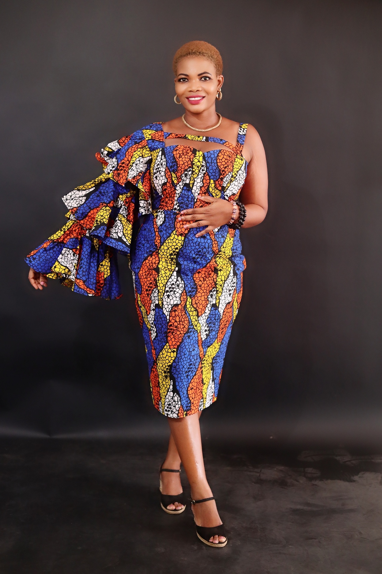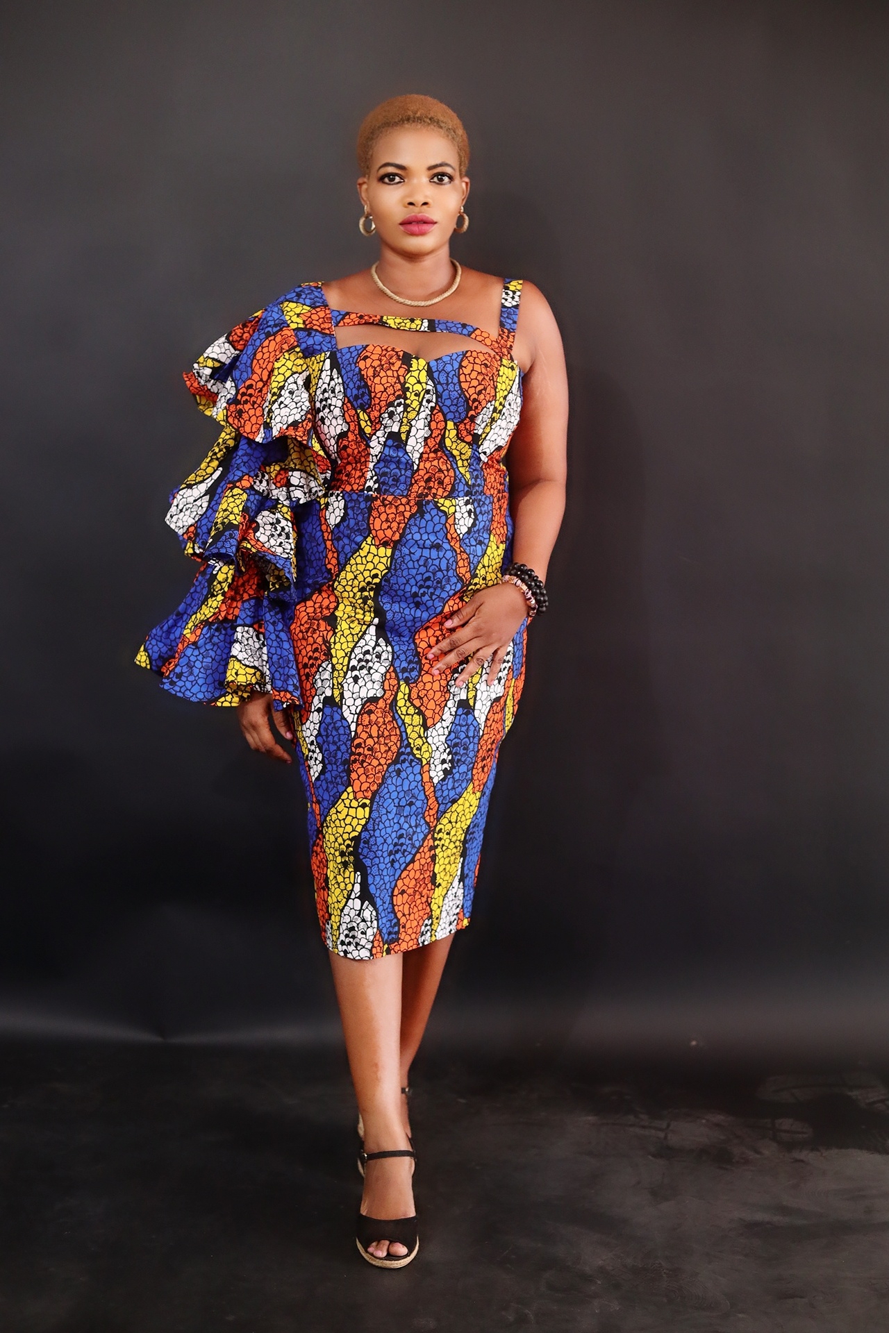 Designed to make a lasting impression, featuring a fitted Sihoutte that flatters every curve. A balance of boldness & elegance. Its stand out details is the flare-stepped single hand design, which adds movements and drama to your look. Crafted with vibrant multi-color fabric , this piece brings together culture, creativity and modern style.