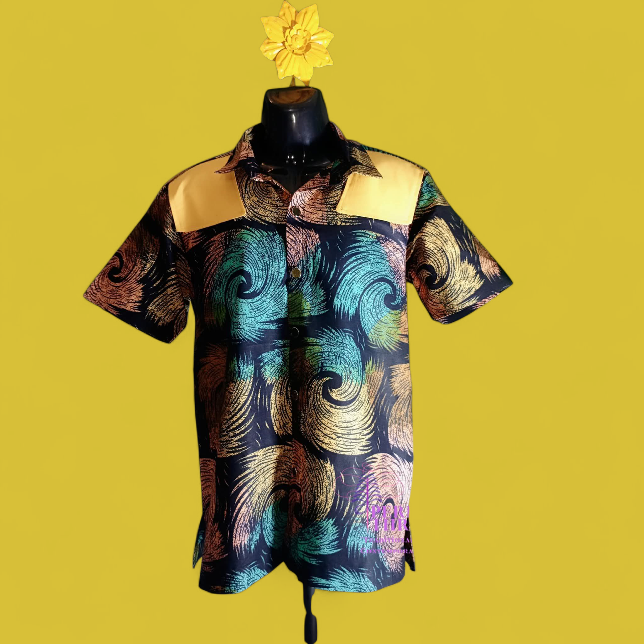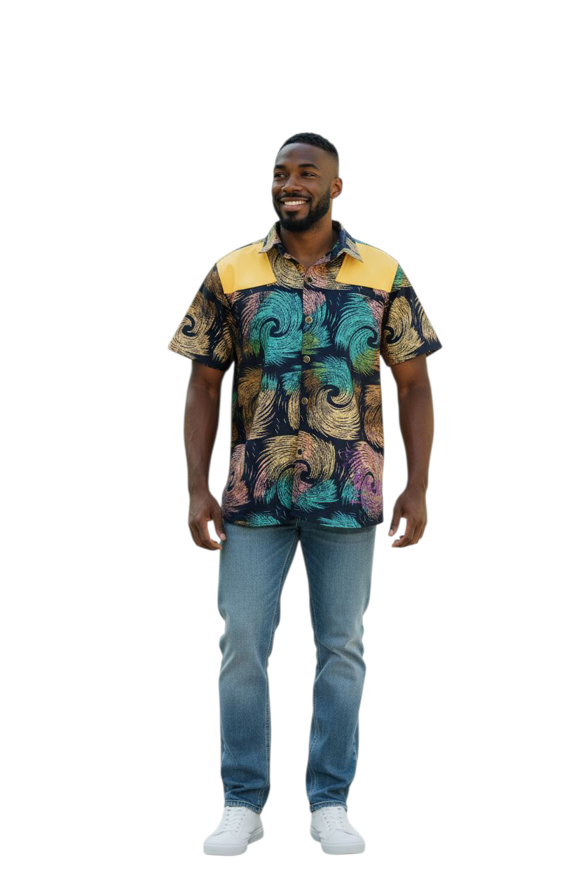 Bring vibrant energy to your wardrobe with the HORIZON shirt, A stunning multicolor design that captures bold African creativity. This shirt features a distinct yellow shoulder stripes that highlight the upper frame. Giving a sharp and confident look. Designed with a button down front, collar and short sleeves. Ot blends modern tailoring with trends 🔥🔥Perfect for casual outings, events or making colorful statements.