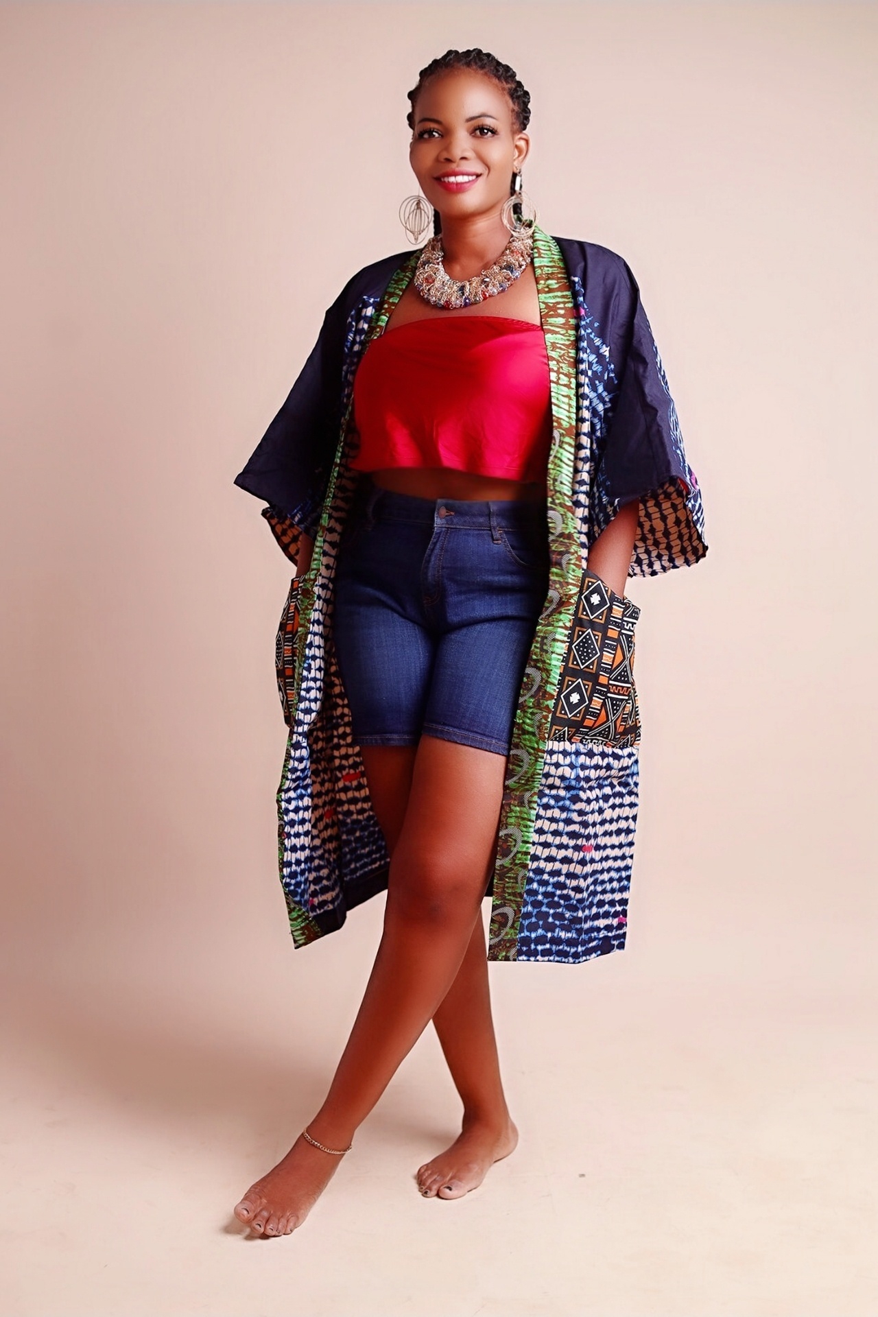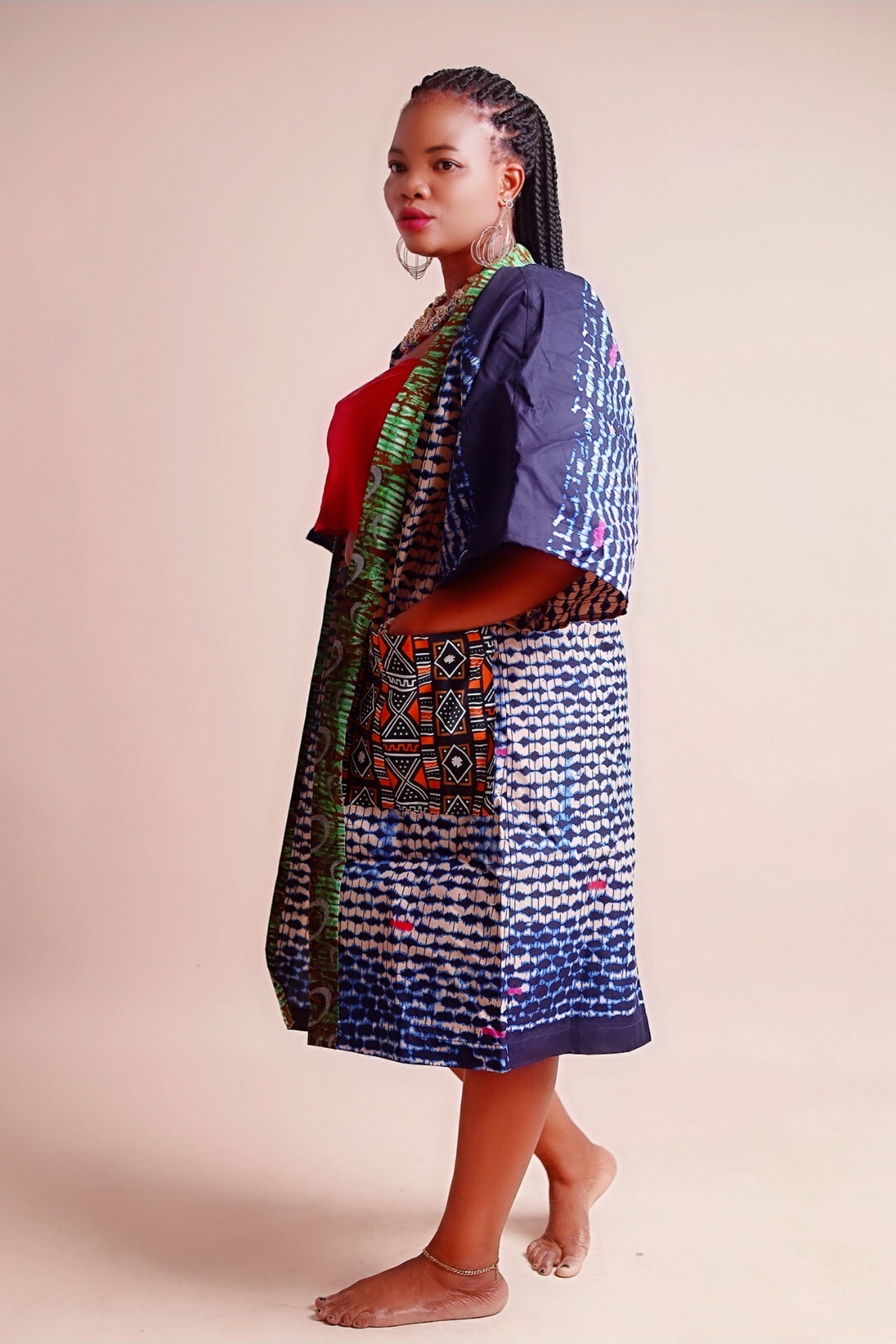 designed with a unique front opened style-this versatile piece can be layered over a dress, jeans or a simple slip for that instant chic touch. The knee length gives it a modern edge while the contrast of two fabrics-bold African print for the body and a complementary fabric for the front penals, Make it a true stand out. Lightweight yet stunning, this KIMONO adds fliar and sophistication to any outfit